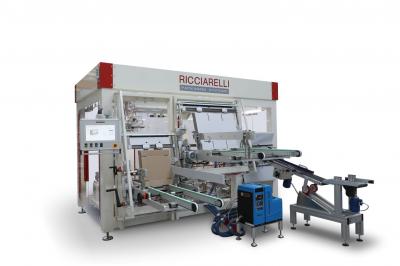 Automatic casepacker for bags and cartons (standing insertion) in “wrap-around” boxes made by display tray and cover.