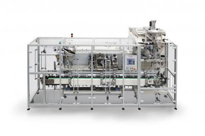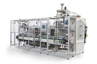 High speed and continuous motion vertical packaging machine for the production of pillow bags, block-bottom bags, and double-block-bottom bags, from a reel of flexible film. Actuation of the sealing system at linear following and feeding of film with brushless motors. The machine is linked to an automatic horizontal-squaring unit suitable to close squared top and bottom bags, in vertical position, filled with bulk products.