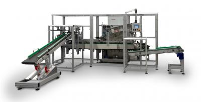 La macchina è predisposta per ricevere sacchetti a fondo quadro con saldatura superiore completa per successiva applicazione di cavallotto in cartoncino.